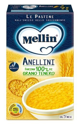 La Pastina Mellin 320 g (es. Stelline, Anellini, Tempestina) è una pasta di semola indicata dallo svezzamento (4°–5° mese), salvo diverso consiglio del pediatra. Realizzata con farina di grano tenero, arricchita con vitamina B1 e calcio, è priva di latticini e adatta anche a bambini sensibili. Cotta in circa 4 minuti, si adatta a brodi, passati di verdura o latte, facilitando l’abituazione dei piccoli alle prime pappe.